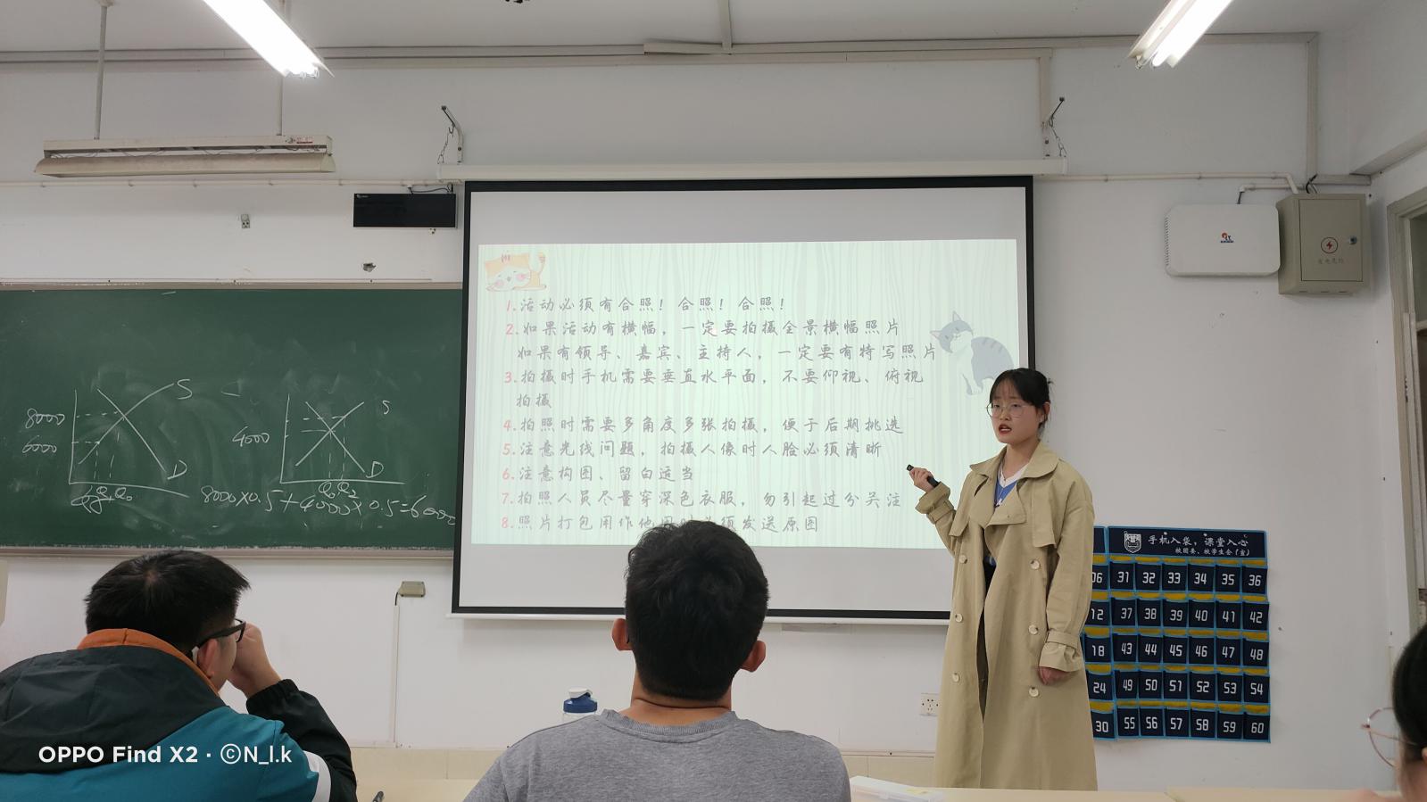 会议伊始,张素雅同学就新闻稿写法进行了大致描述。随后,她从四个方面对新生干事们进行了新闻稿的讲解。首先讲解了新闻稿的时效性、字数等要求,从基本方面让新生干事们了解如何写一篇新闻稿。其次给新生干事们展示了新闻稿中的易犯错误,一些例子引起在座的新生干事们哄笑,同时也让新生干事们了解到了自己会犯的错误。随后对不同类别的新闻稿写法进行了细分要求,详细说明了不同新闻稿的性质及含义。最后告知了新生干事们新闻照片的要求,让新生干事们认识到新闻照片的不同点。讲解结束后,张素雅同学对新生干事们寄予“因为热爱而选择,因为责任而坚持”的人生格言。