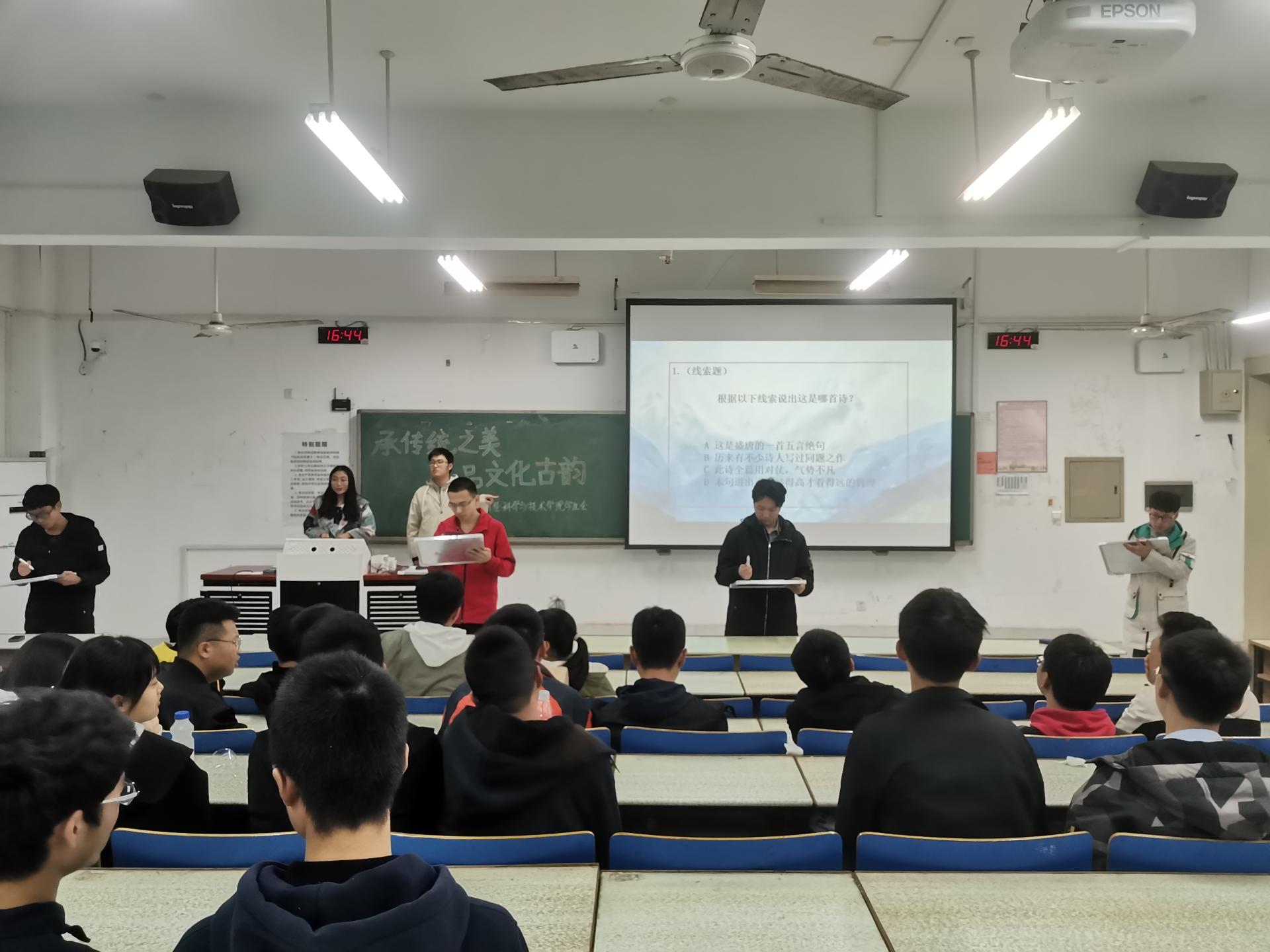 本场比赛分为两个环节:题海战术和心有灵犀。题海战术为十道必答题,每组队员在选择特定题组后进行作答。该关主要考察的是同学们对传统文化的掌握程度,每位选手平时丰富的积累和广阔的见识。在本轮比赛中每队选手表现优异,参赛选手热情高涨,各队比分不相上下,就此比赛进入第二环节心有灵犀,该关为线索题,需要每队全部四名选手同时作答,再根据答对的选手人数进行评分。这个环节不仅考验同学们的知识储备,还依赖于相互之间的默契配合。每一组的参赛选手都应该紧密团结,才能斩获佳绩。在经过精彩绝伦的激烈对决后,比赛圆满结束,“说啥都队”获得第一名、“潇湘夜雨队”获得第二名、“稽古队”获得第三名。