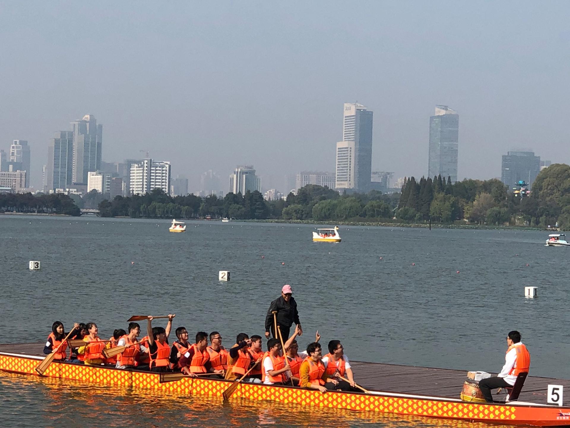 上午9时20分,22支队伍依次出场进行预赛,公司代表队的17名队员齐心协力,俯身、插桨、划桨、拔桨一气呵成,连贯有力,几个队伍之间争先恐后,你追我赶。湖畔热闹非凡,同学们围观湖岸边,加油呐喊声此起彼伏。在紧张激烈的角逐下,太阳成集团122ccvip代表队不敌其他队伍的强势追击,位居小组第四名,无缘决赛。