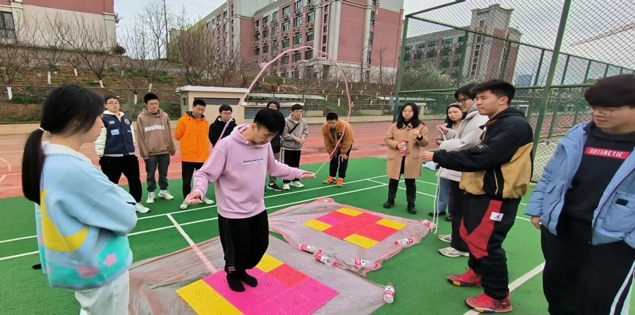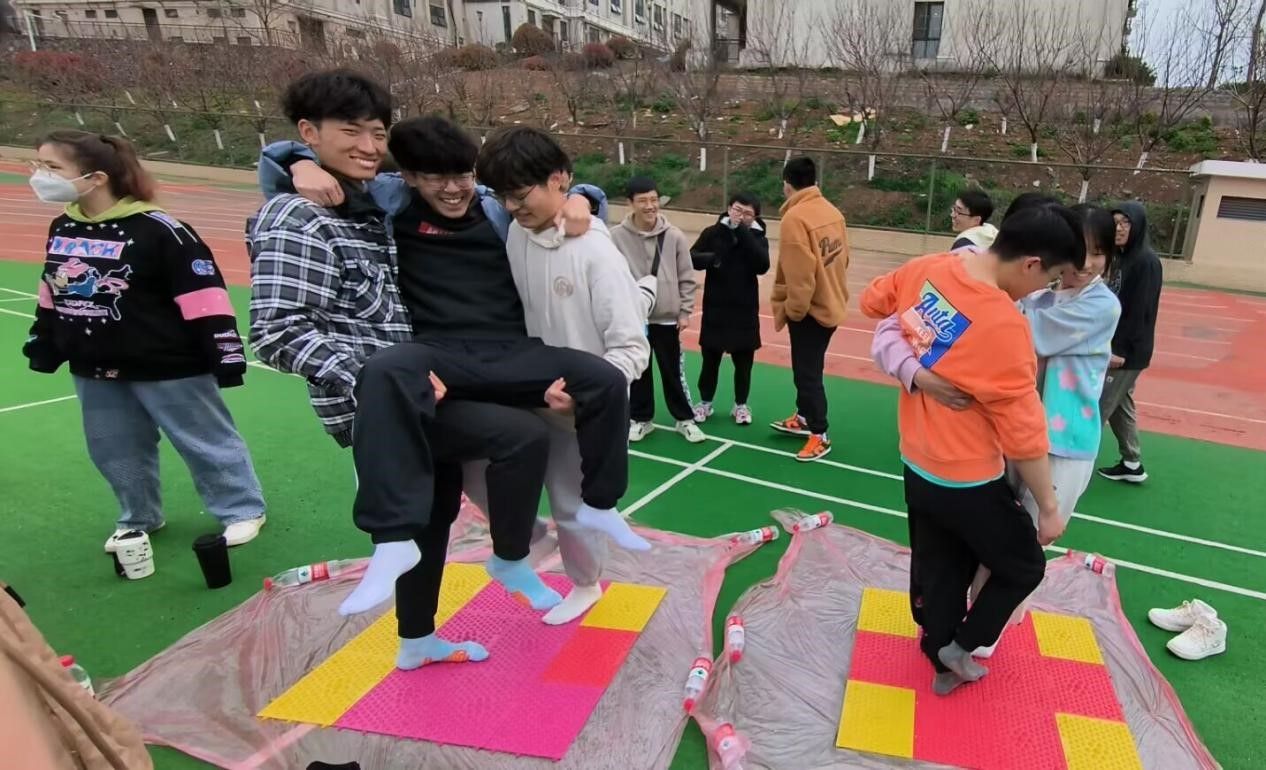 本次趣味运动会比赛项目包括趣味斗地主、定点投篮、指压板跳绳、两人三足接力赛和指压板木头人五个项目。比赛项目集趣味性、娱乐性、协作性和竞争性于一体,既是力量的角逐,又是智慧的较量;既是参赛队员风采的展示,又是对团队协作能力的检验。在两人三足接力赛中,选手们紧抱队友,相互扶持,一起奔向终点,一起一跳间不仅考验着选手们的平衡力,更考验着他们相互配合的默契度。指压板木头人比赛中选手们全神贯注,根据裁判发出的指令做出对应动作,彼此互相鼓励、互相帮助,充分发扬了团队协作的精神。赛场下观赛同学热情高涨,为选手们加油助威。裁判公平公正,时刻记录着得分,更新着位次。同学们相互追逐,共同协作,亚青操场上充满了欢声笑语。