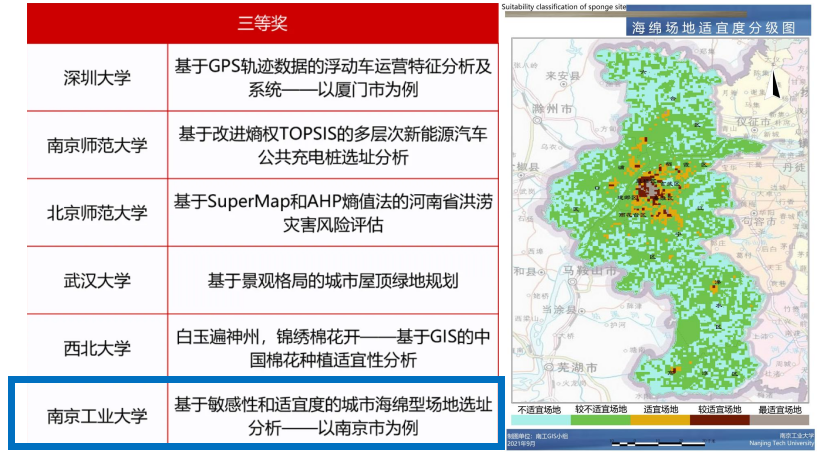 公司学子宋子晗、尤燕玲、皮均正和杨一珩瑞组成的参赛小组在卢华兴教授、张云鹏副教授指导下,在本次大赛中取得了全国第九名的好成绩,获得了分析组参赛类别的三等奖。小组成员以南京市为研究对象,对综合城市水文敏感性和用地适宜度进行分析,通过城市规划的视角确定了一个简易的框架,确定了南京市海绵型设施的选址区,为海绵城市建设提供了新的思路和视角。