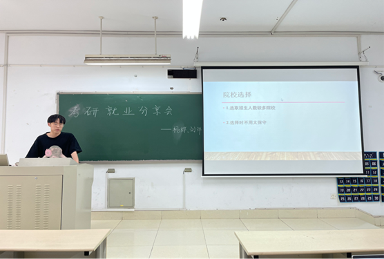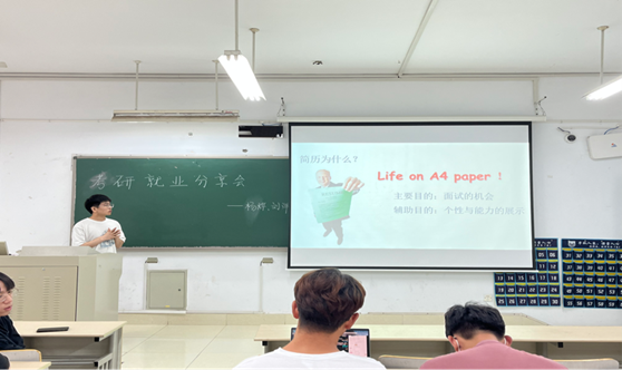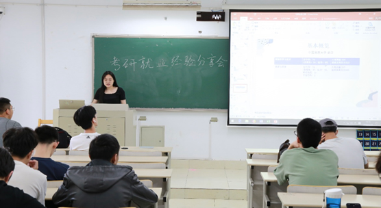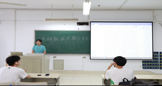 几位同学首先就考研院校选择、专业选择、初复试准备、各科如何备考、如何调整心态和作息、如何选择教辅资科等考研方面分享了自己的感受和经验。其次在就业方面介绍了就业面试时的着装礼议及简历的制作与技巧等。他们强调,在备考时,要享受这段学习的过程,不要受他人影响,应该形成和顺应自己的学习节奏,始终保证一个良好心态是极其重要和必要的;守住初心,坚持不懈,持之以恒,凭自己最大的努力朝着自己的目标迈进。他们精彩的分享不仅给备战考研和就业的同学提供了宝贵经验,也给立志考研就业的同学指引了方向,使同学们对未来有了一个更具体、更清晰的认识。