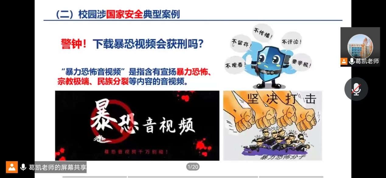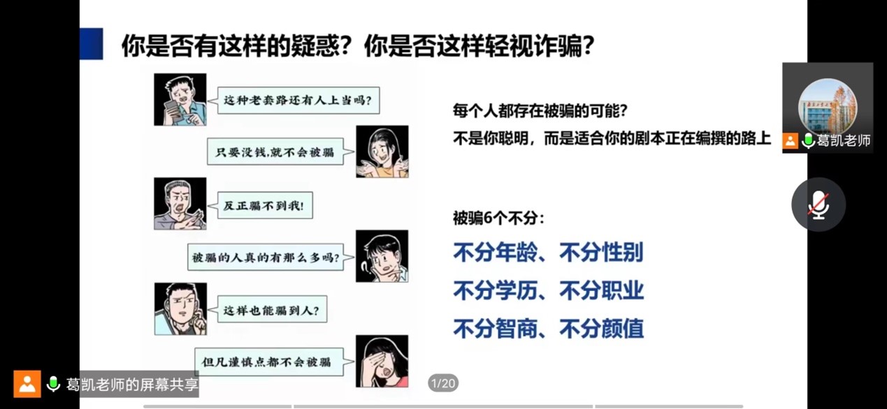 会议伊始,葛凯老师通过网络安全、交通安全以及日常生活中需要注意的事项等多个方面为同学们普及了大学中的安全知识。接着,葛凯老师介绍了新生初入大学时可能遇到的问题,通过多个安全教育视频着重强调了网络安全,让大家提高警惕性并认识到其中的巨大危害。接下来,他又向同学们普及日常生活中的安全知识,通过真实的案例详细介绍了身边可能存在的安全隐患,让同学们感受到了生命的脆弱和培养良好生活习惯的宝贵。