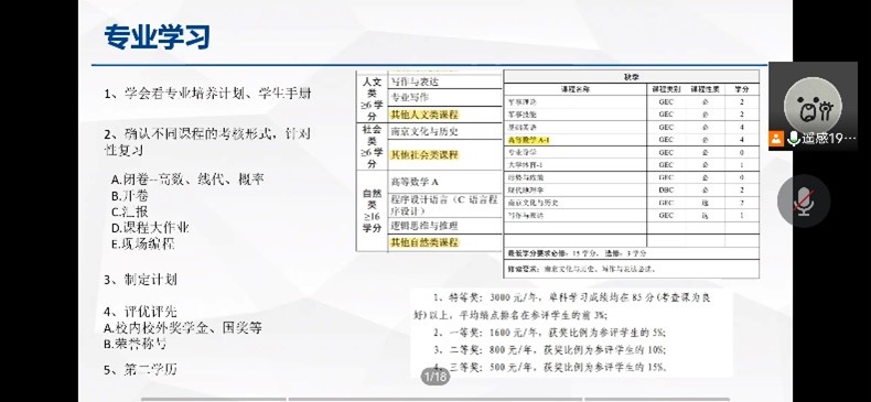 会议伊始,学长吕明睿由四个方面入手,以一张简历介绍大学努力的目标与方向;从科研经历介绍学科竞赛的重要性,要抓住机会,积极参与;从考级过程分享过关方法,要提前准备,结合实际;从员工生活分析利弊,要善于选择,合作交流。接下来,学姐尤燕玲着眼于专业学习与选择,结合自身真实体验,为同学们解答未来可能遇到的心理困惑。