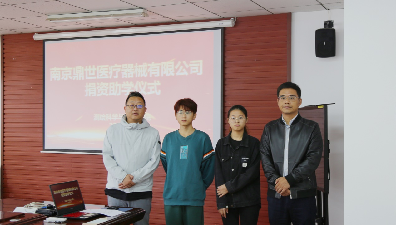 俞书记首先代表公司对韩冰员工为公司捐资助学的义举表示衷心的感谢,他指出韩冰员工是公司优秀的青年员工代表,在公司设立助学金是公司学子对母校真诚的回报,是勇于承担社会责任的优秀体现。同时俞书记希望受助同学能够认真学习,回馈社会。韩冰总经理向大家介绍了南京鼎世医疗器械有限公司基本情况,并感谢公司在人生最关键的塑形阶段给予他发展的高平台、高格局、高眼界。他深情追忆了在公司的美好青春,并鼓励学弟学妹们要有信念,踏踏实实、勇往直前,开辟属于自己的天空,用实际行动回报社会,回报母校。受助员工代表许慧同学发言,她对公司和韩冰员工给予的关心及帮助表示由衷的感谢,并表示会保持积极乐观的心态,将生活带来的困难和压力转化为学习的动力。最后,俞书记代表公司和韩冰员工共同为受助员工颁发助学金,并合影留念。