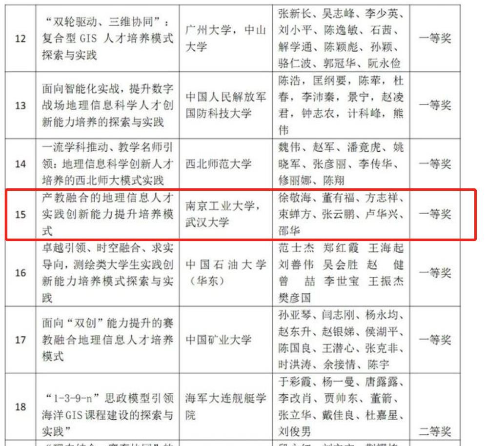 2023年6-7月,中国地理信息产业协会教育与科普工作委员会主办了第四届全国高校GIS教学成果奖评选,经过评审委员会网评和现场答辩会评等环节,最终评出特等奖4项,一等奖13项,二等奖21项。公司经理徐敬海教授领衔完成的教学成果“产教融合的地理信息人才实践创新能力提升培养模式”荣获一等奖。