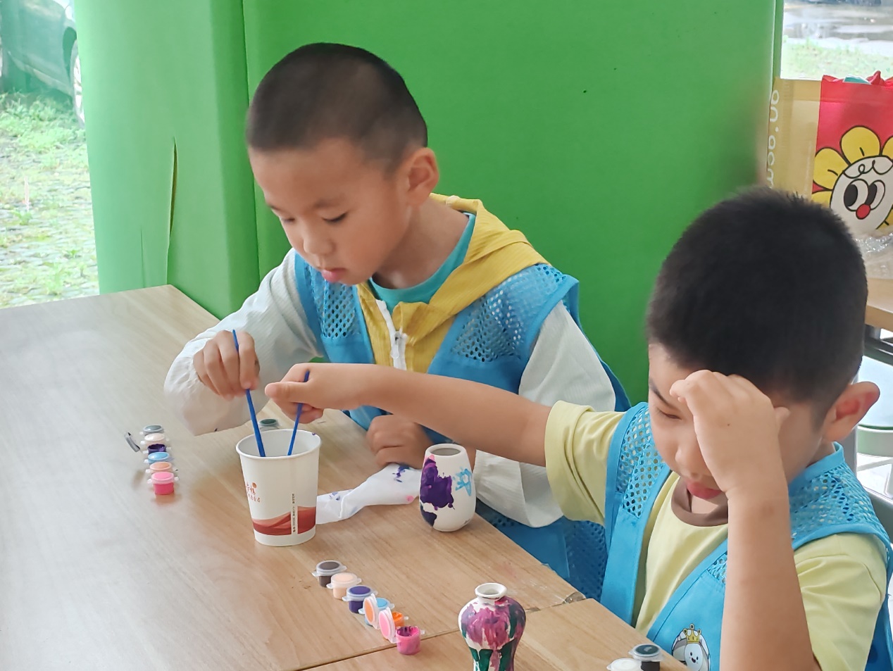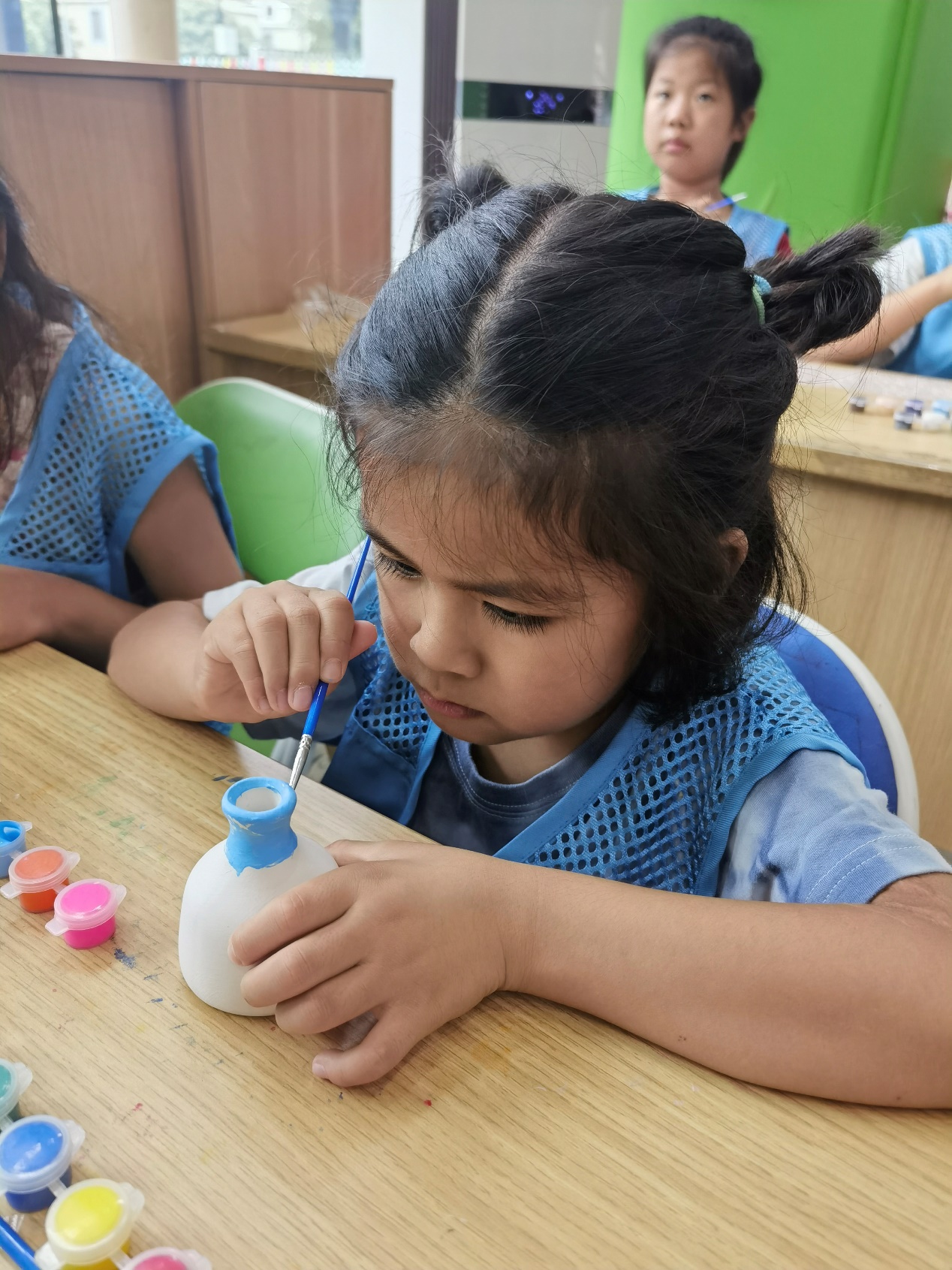 为了加深小朋友们对课程内容的记忆,活动尾声三位同学组织了一场创意手工艺制作,让每个小朋友使用石膏瓷瓶和颜料自由创作,绘制专属的个性化瓷瓶。小朋友们都充分发挥了创造力和动手能力,创作出各式各样的艺术作品,既有模仿梵高《星空》的抽象画,也有复刻青花瓷的经典图案,每一件作品都充满了童趣与个性。