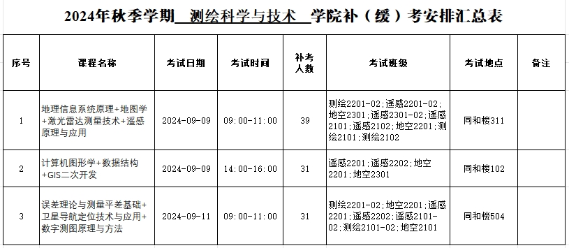 2024年秋季学期太阳成集团122ccvip补(缓)考安排汇总表
