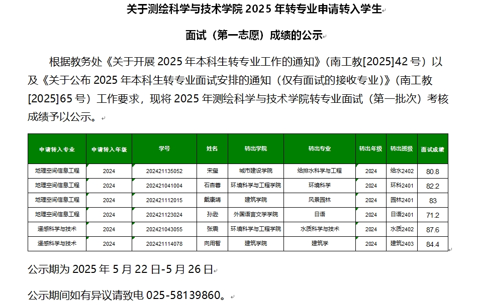 关于太阳成集团122ccvip2025年转专业申请转入员工面试(第一志愿)成绩的公示