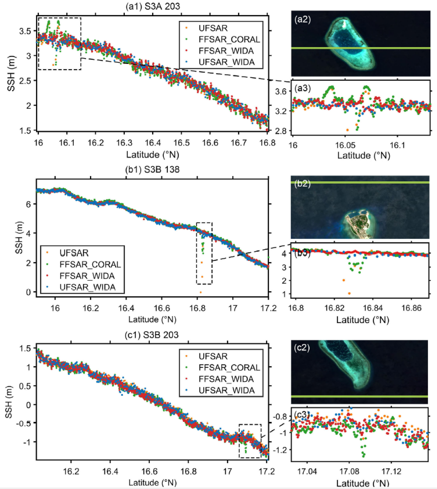 受波形污染影响,传统雷达测高在近海精度较低,严重影响了其在近海的相关应用。合成孔径雷达测高比传统雷达测高具有更高的分辨率和信噪比,通过全聚焦合成孔径技术(fully focused synthetic aperture radar,FFSAR),能够进一步提升近海测高数据的精度。然而,受陆地介质的干扰,传统FFSAR算法在近海依然存在较大误差。针对上述问题,研究提出了一种波形干扰探测和修复算法(waveform interference detection and removal algorithm,WIDA),通过引入波峰突变指数、差分波形突变指数和强干扰区识别污染波形,进行波形剔除和修复。通过与独立验潮站观测数据和航空重力求解大地水准面对比表明,改进的WIDA算法比传统FFSAR算法在近海海面高获取中更具优势,该算法可以在近岛屿等强干扰区域获取更为稳定的海面高结果,精度可提升20%以上,图2。研究成果发表在IEEE Transactions on Geoscience and Remote Sensing(一区TOP,影响因子8.6),详见论文[5]。