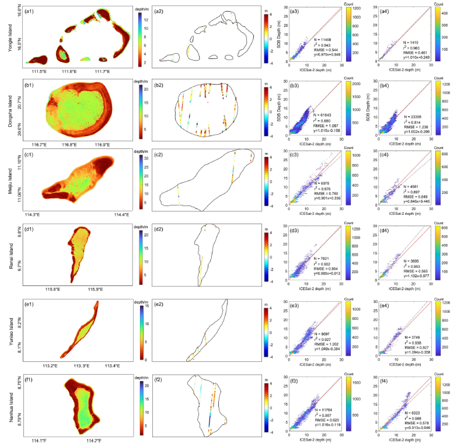 构建了融合多光谱影像和星/机载激光测深提取高分辨率浅水海底地形的自动化并行数据处理平台,可用于全球浅水区高分辨率水深数据提取。研究融合100多幅Sentinel-2多光谱影像和1200余轨ICESat-2数据构建了覆盖整个中国南海岛礁区域水深模型HHU24SWDSCS。该模型包含南海100多个岛屿水深数据,空间分辨率为10 m,与独立机载激光测深数据对比表明HHU24SWDSCS精度为0.53–1.24m,外部检核见图1。HHU24SWDSCS已公开发布(https://zenodo.org/records/13852568),可代替现有全球海深模型作为南海岛屿水深参考数据。研究成果发表在Earth System Science Data(一区TOP,影响因子11.6),详见论文[2]。